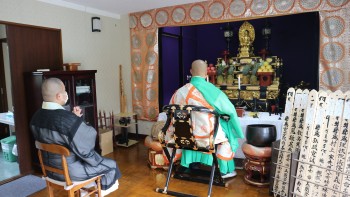 例年同様に13日、みやぎ霊園2階の供養室にて、また当庵合同供養墓 杜の苑にて合同供養会を厳修し、3日間に亘り各家々に5名の僧侶で棚経に巡った。16日には本堂にて合同供養会を厳修した(13日の杜の苑での合同供養会の写真は、葬儀等の関係で副住職一人での厳修だった為、本年はありません)。