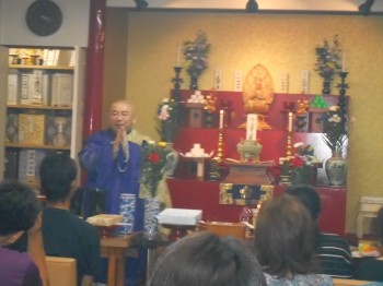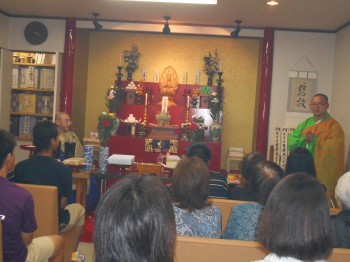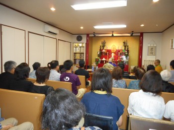お盆合同供養会を本堂にて厳修する。今回は本堂に入りきれない程の大勢の参拝者と共に供養した。 庵主の挨拶後、副住職が「お盆の意味」について法話した。